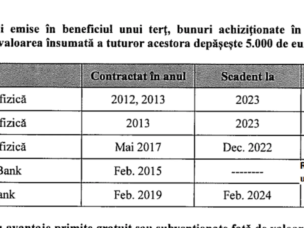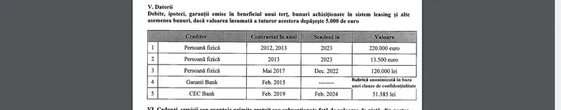 La categoria „datorii”, Nicolae notează că are o datorie la Garanti Bank, dar la capitolul vaoare găsim: „rubrică anonimizată în baza unei clauze de confidențialitate”. Cel mai probabil, rata este mai mare de 20 de euro. Putem spune că senatorul plătește rate mai mari decât veniturile declarate.