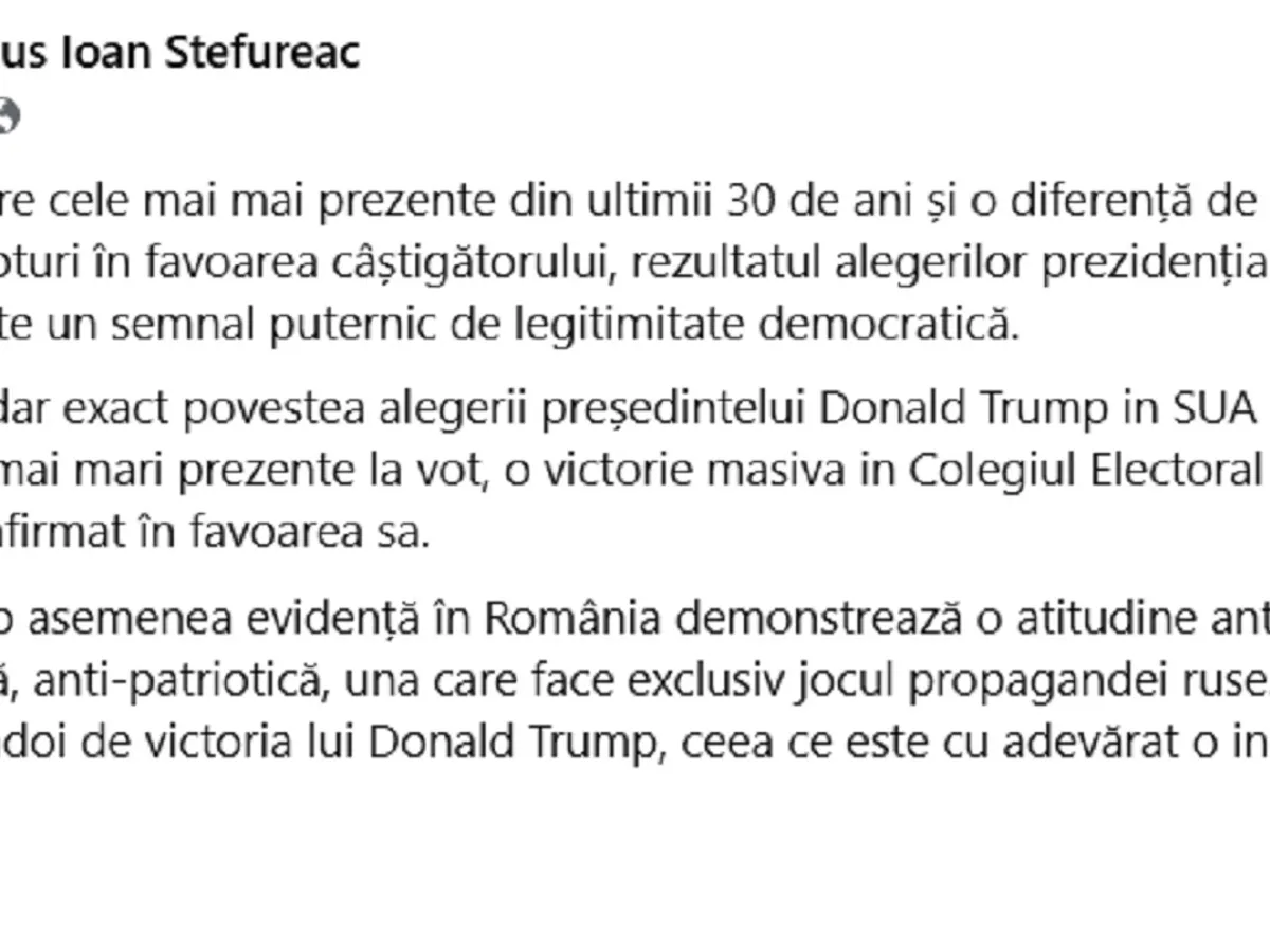 A contesta o asemenea evidență în România demonstrează o atitudine anti-democratică, anti-patriotică, una care face exclusiv jocul propagandei ruse. Este ca și cum te-ai îndoi de victoria lui Donald Trump, ceea ce este cu adevărat o inepție”, a scris Remus Ștefureac, directorul INSCOP pe pagina sa de Facebook.