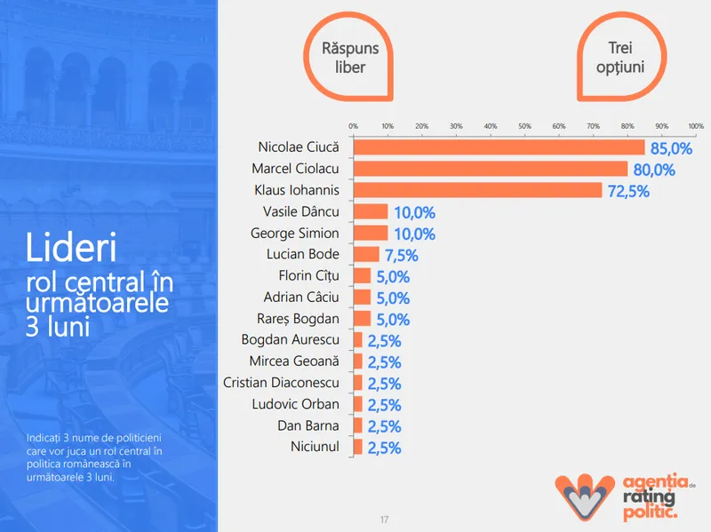 Liderii politici care se vor afla în următoarele trei luni în centrul atenției sunt, pentru vasta majoritate a respondenților: Nicolae Ciucă (85%), Marcel Ciolacu (80%) și Klaus Iohannis (72,5%). Nici un lider al opoziției nu are o prezență semnificativă în această listă.