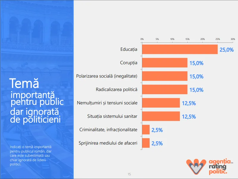Între temele de interes pentru public cărora politicienii ar putea să le acorde mai mult interes jurnaliștii punctează: educația (25%), radicalizarea politică (15%), corupția (15%), polarizarea socială (15%).