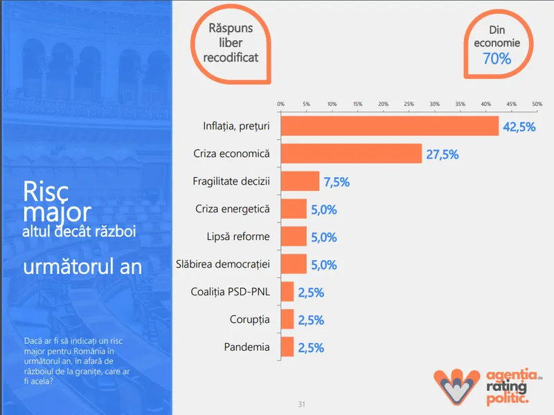 Inflația și situația economică sunt de departe temele care vor marca următoarele 3 luni, în opinia jurnaliștilor din panel (peste jumătate dintre ei). Aceste teme reprezintă și riscul major pentru România pe termen mai lung, pentru următorul an de zile (două treimi dintre respondenți). Jurnaliștilor li s-a cerut să se gândească la orice alte teme în afara războiului din Ucraina.