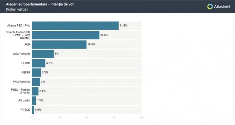 Potrivit celui mai recent sondaj realizat de AtlasIntel, în exclusivitate pentru Digi24, alianța PSD-PNL ar obține la alegerile europarlamentare din luna iunie doar 31,6% din voturi.
