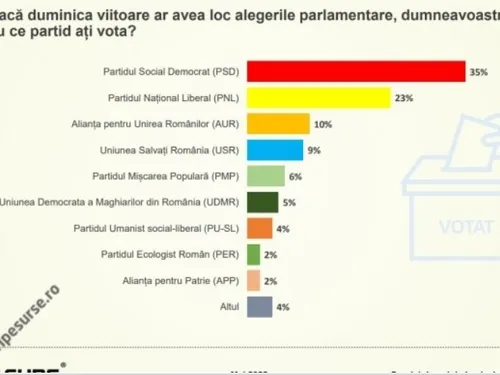 Astfel, PSD și PNL își păstrează procentele din precedentul sondaj SURS, din luna aprilie, AUR scade de la 12% la 10%, iar USR pierde un procent, de la 10 % la 9%.