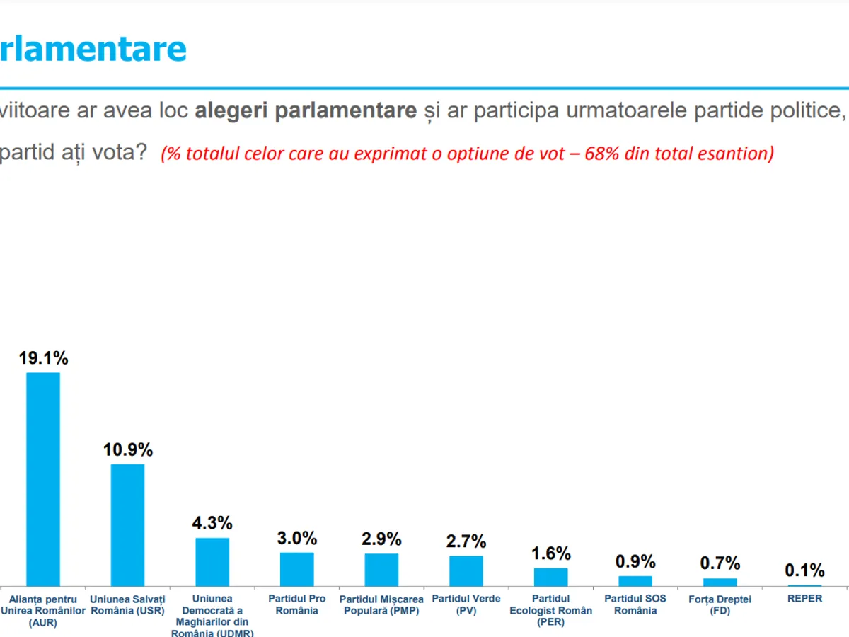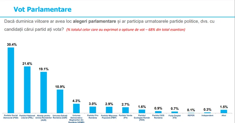 Clasamentul opțiunilor de vot se bazează pe răspunsurile a 68% din totalul eșantionului, respectiv a românilor care au exprimat o opțiune de vot, indiferent daca sunt siguri sau nu ca se vor prezenta la urne.