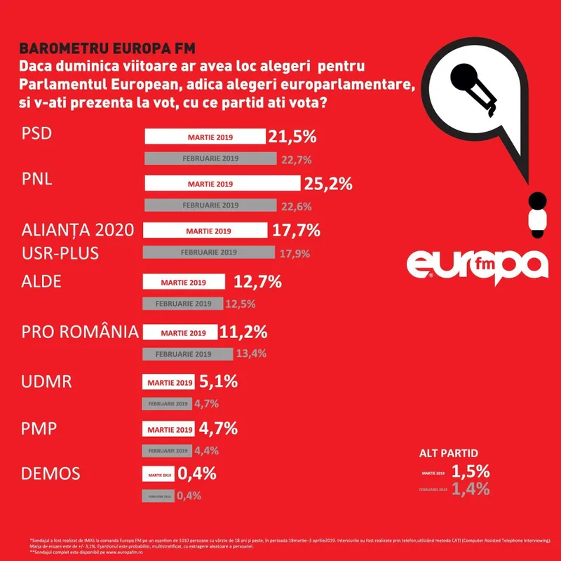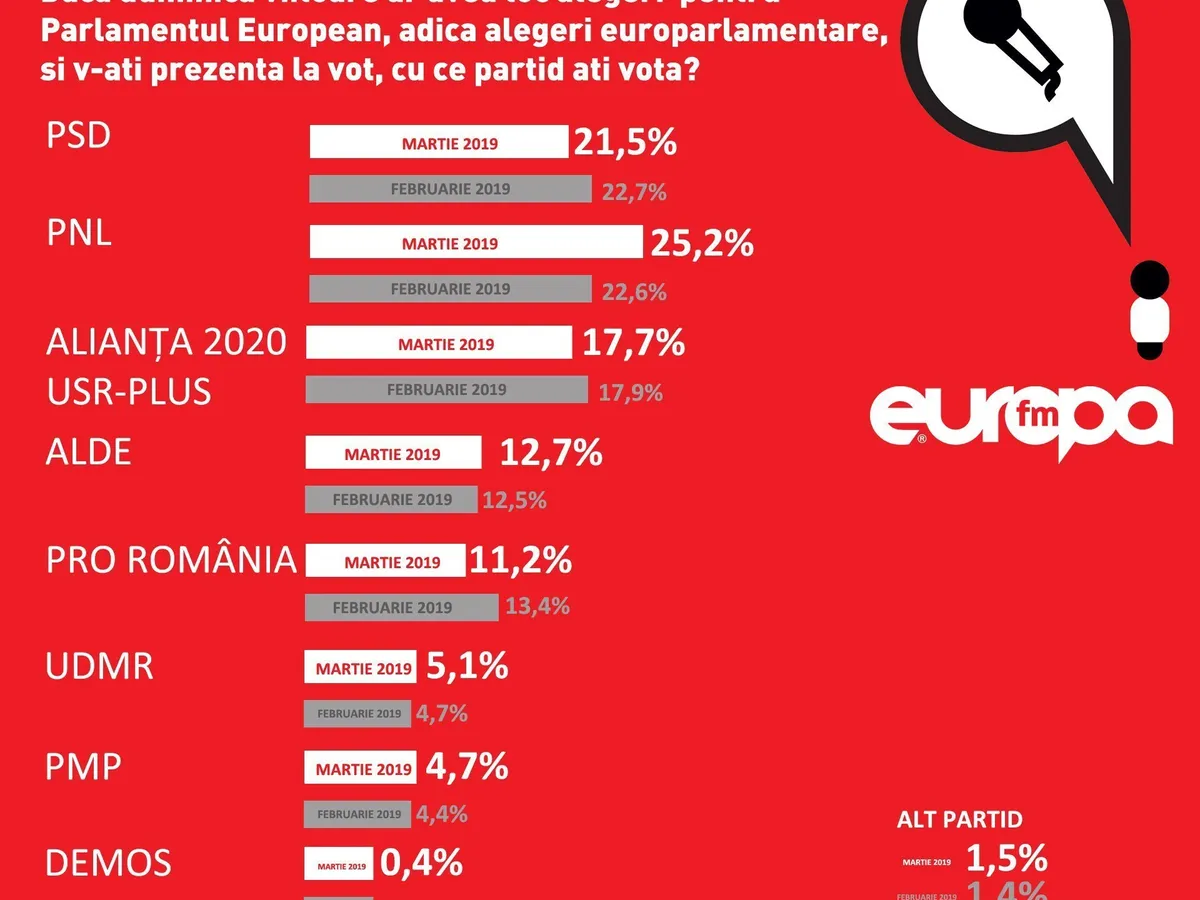 Dacă ar avea loc alegerile europarlamentare duminica viitoare, PNL ar obține 25,2%, iar PSD 21,5%, după cum arată datele din BAROMETRU EUROPA FM pentru luna martie.