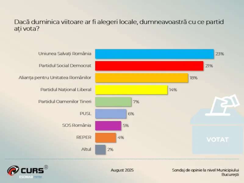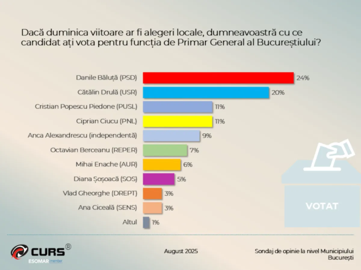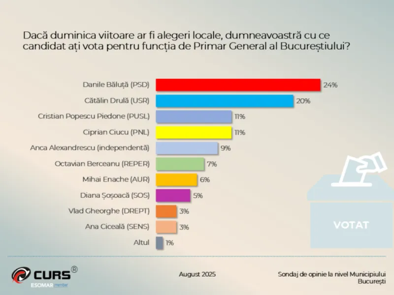 Potrivit sondajului CURS realizat între 12 și 22 august, Daniel Băluță (PSD) ar obține 24% din voturi dacă duminica viitoare ar avea loc alegeri pentru Primăria Generală a Capitalei.