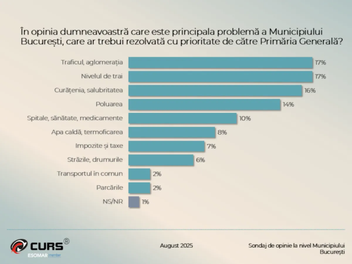 Printre principalele probleme semnalate de locuitori se numără traficul și aglomerația (17%), nivelul de trai (17%), curățenia (16%), poluarea (14%) și situația din sănătate și spitale (10%).