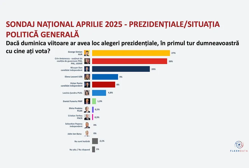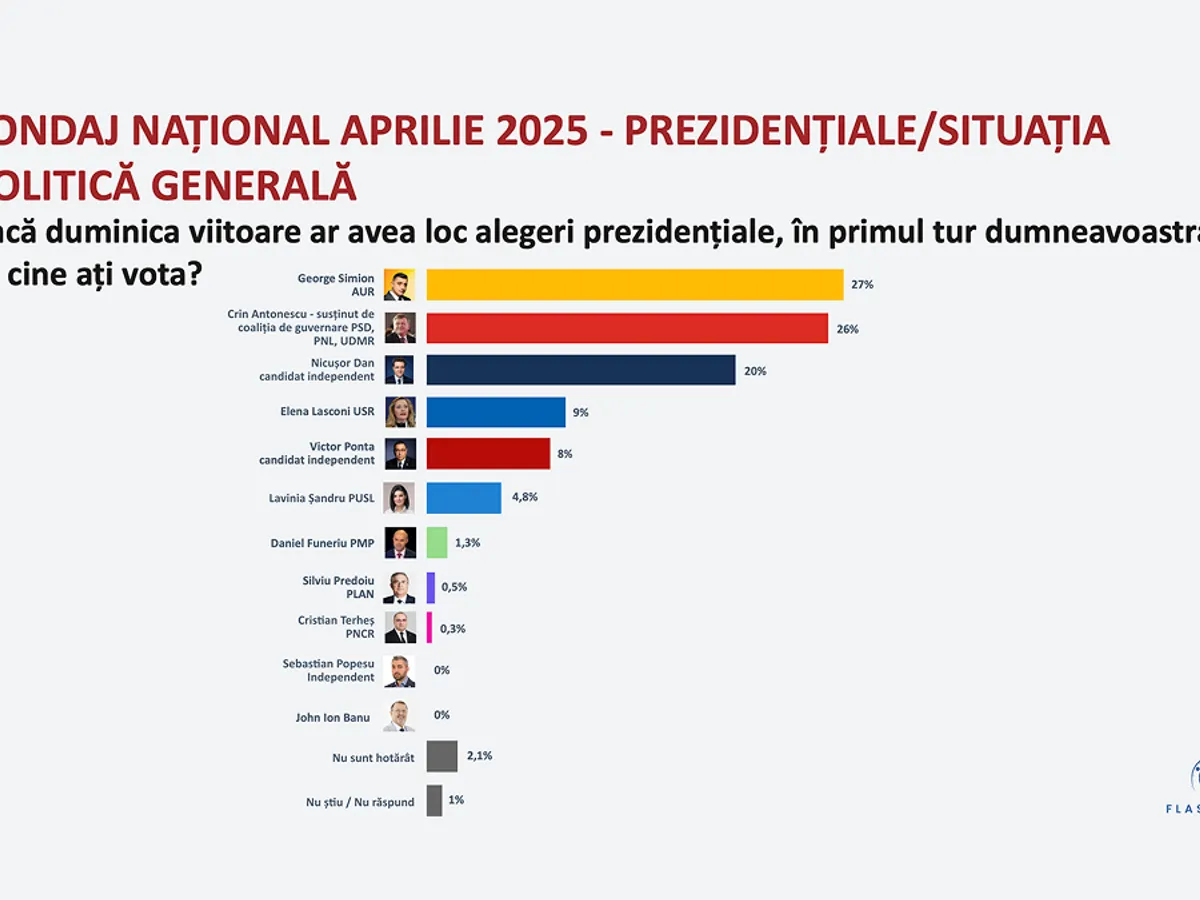 Un sondaj realizat de Flashdata înaintea alegerilor prezidențiale din 4 mai arată o competiție extrem de strânsă între George Simion și Crin Antonescu, cei doi fiind despărțiți de doar un procent în intențiile de vot.