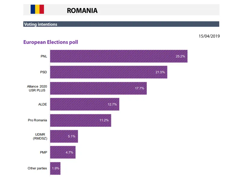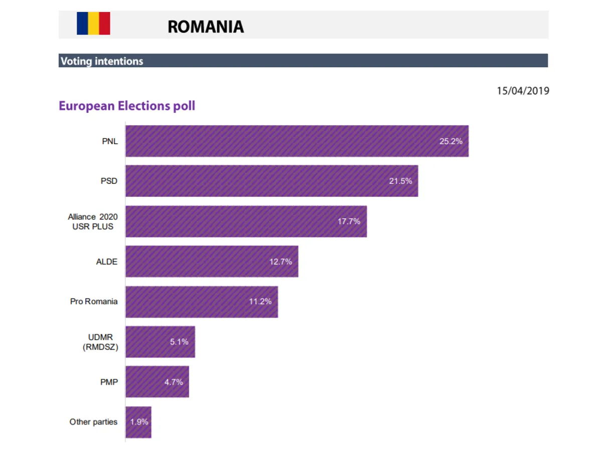 În România, conduce PNL cu 25,2%, urmat de PSD cu 21,5%, Alianța USR-Plus aflat la 17,7% și ALDE – 12,7%. Pro România are 11,2%, UDMR – 5,1% și PMP – 4,7%