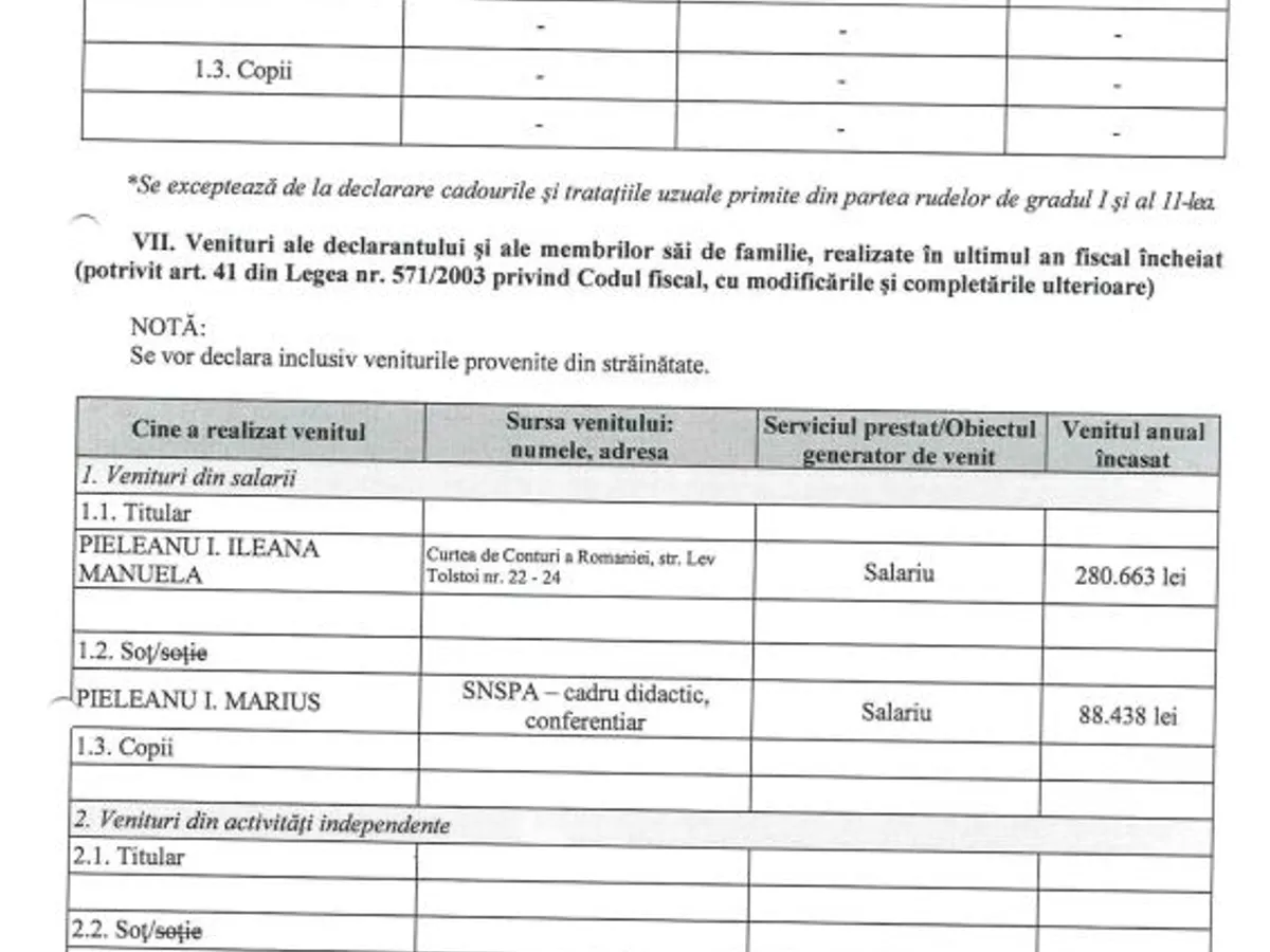 Soția este angajată la Curtea de Conturi pe poziția de consilier de Conturi. În anul 2018 a câștigat suma de 280.663 lei. Ileana Pieleanu a câștigat, lunar, 23.380 de lei, aproximativ 5.100 euro în fiecare lună. Salariu este cu doar câteva sute de euro mai mic decât al președintelui Curții de Conturi.