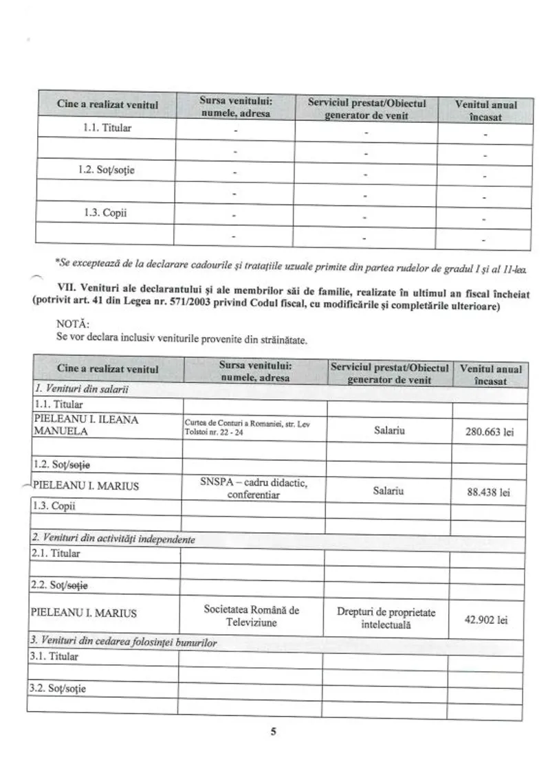 Soțul Marius Pieleanu a câștigat 88.438 de lei de la SNSPA unde este cadru didactic și 42.902 lei de la TVR. Pieleanu a mai câștigat, potrivit declarației de avere a soției, și 485 mii de lei de la Grupul de Studii Sociologice Avangarde.