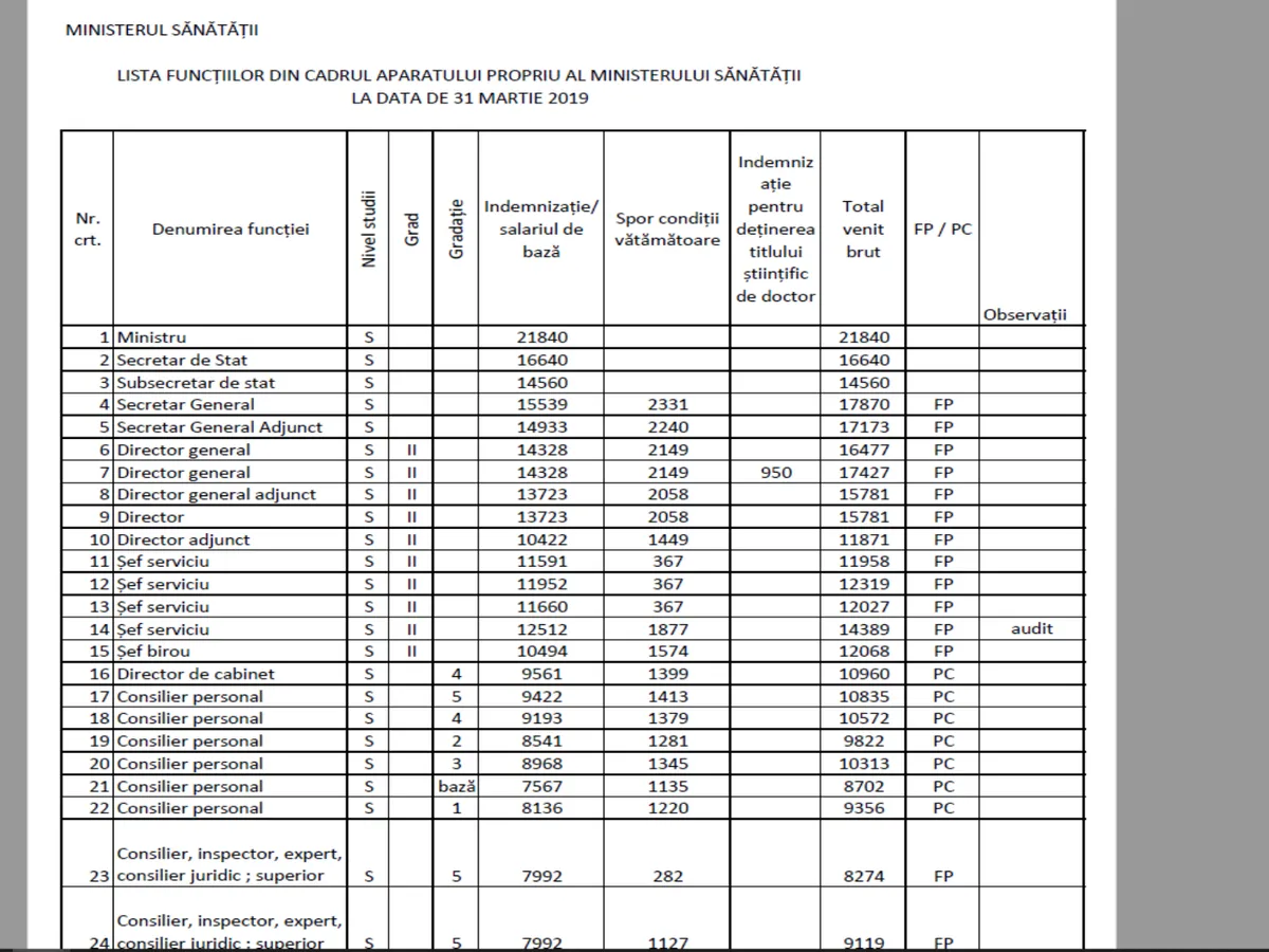 Și la Ministerul Sănătății angajații primesc indemnizații pentru că viața le este pusă în pericol. Secretarul general și directorul general încasează, lunar, 2.149 lei, șeful de birou – 1.877 lei, directorul de cabinet – 1.399 lei. Un consilier personal primește unul dintre cele mai mari sporuri aferente funcției - 1.413, comparativ cu aceeași încadrare din alte ministere. Există 106 funcții care primesc sporuri pentru condiții grele de muncă la Ministerul Sănătății care își are sediul pe Calea Victoriei din Capitală.