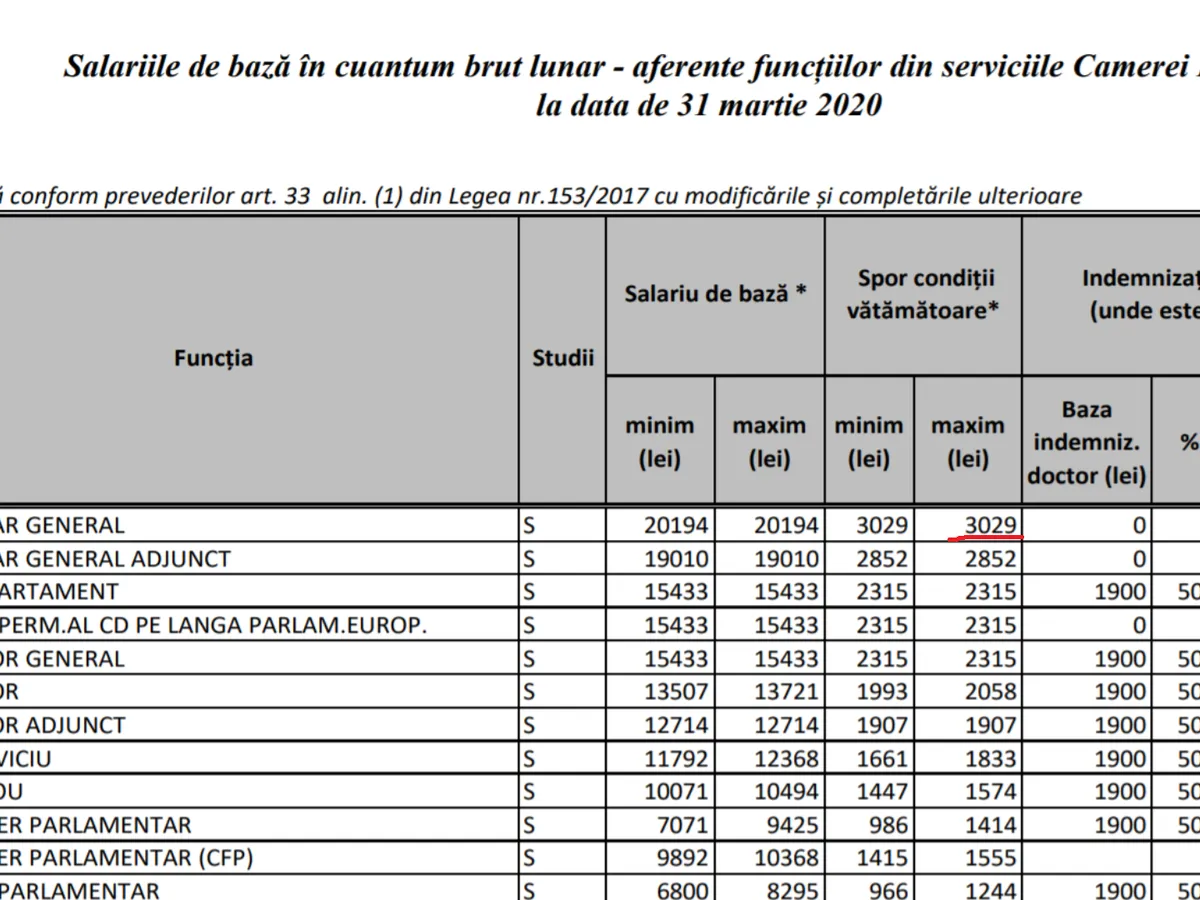 Într-un răspuns pentru Newsweek România, reprezentanții Camerei Deputaților ne-au comunicat: „cuantumul sporului pentru condiții periculoase și vătămătoare de muncă corespunzător funcției de secretar general a fost determinat prin aplicarea procentului de 15% la salariul de bază, în conformitate cu legislația în vigoare în acest domeniu“.
