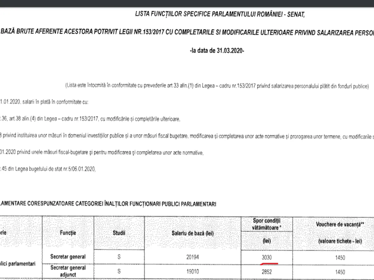 Secretarul general al Senatului primește, potrivit situației de la 31 martie 2020 un spor pentru condiții vătămătoare în cunatum de 3.030 de lei, iar adjunctul suma de 2.800 de lei.