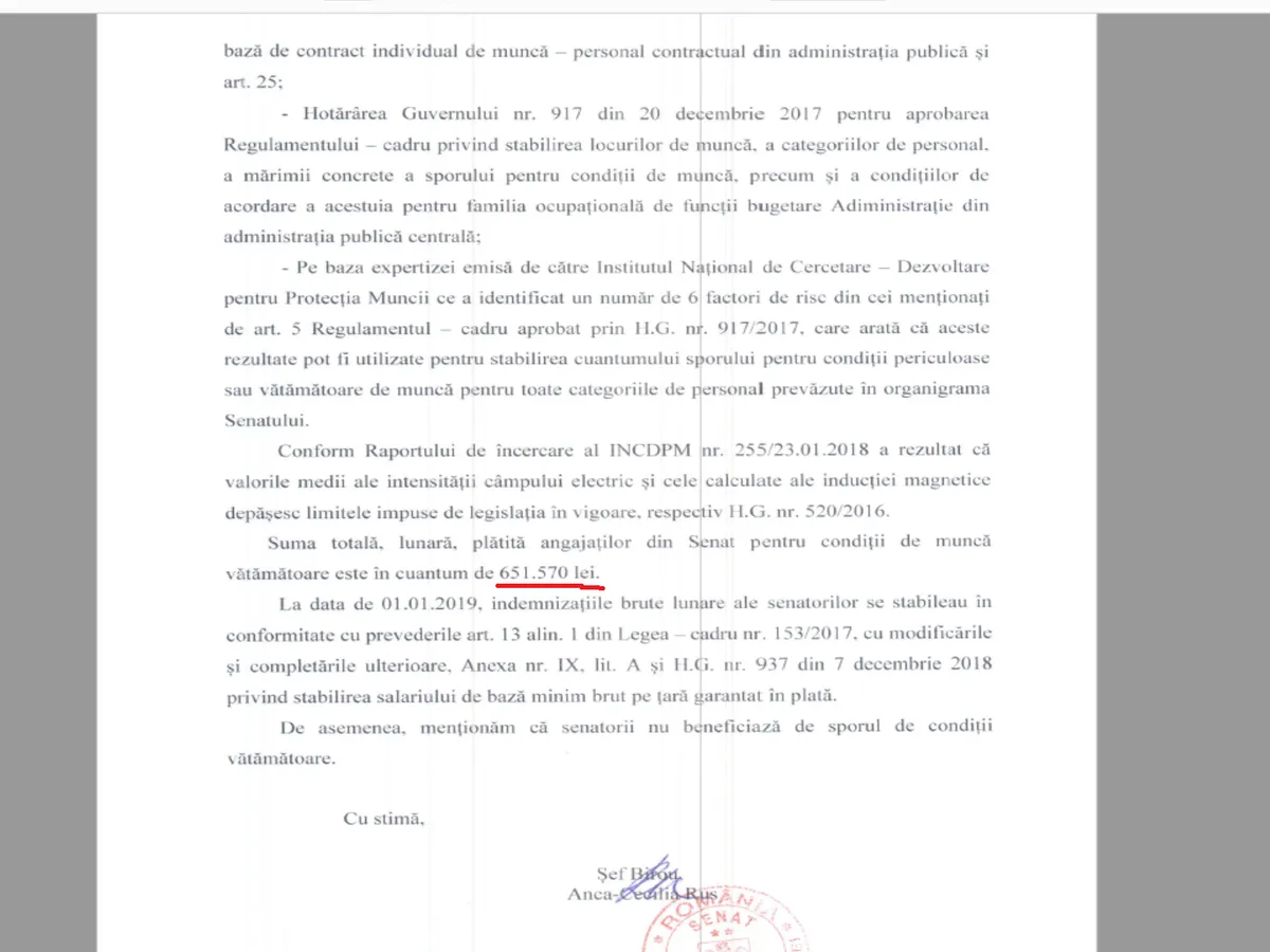 Într-un răspuns pentru Newsweek Romînia, Senatul României arată că „pe baza expertizei emise de Institul Național de Cercetare – Dezvoltare pentru Protecția Muncii ce a identificat un număr de 6 factori de risc… aceste rezultate pot fi utiliziate pentru stabilirea cuantumului sporului de condiții vătămătoare de muncă pentru toate categoriile de personal prevăzute în organigrama Senatului.