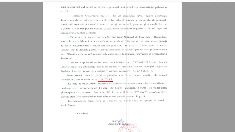 Un șef de cabinet senatorial primește 500 de lei pentru că își pune viața în pericol la locul de muncă.