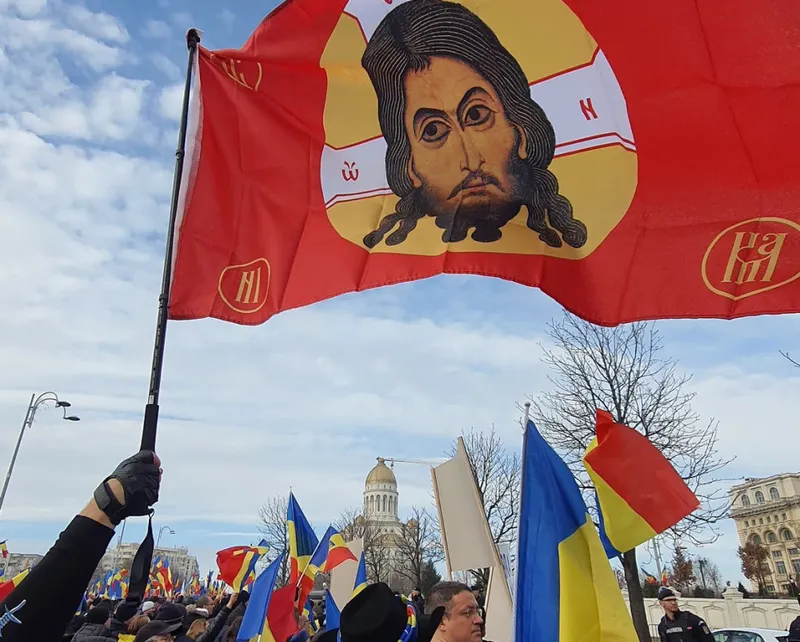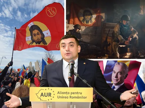 Liderul partidului extremist AUR, George Simion a postat pe pagina sa de X o fotografie controversată de la protestele pro-Călin Georgescu, un rusofil cu viziuni sovietice, aplaudat de presa de propagandă de la Moscova și de chiar de liderii de la Kremlin, în care este prezent un steag roșu folosit care înfățișează chipul lui Iisus Hristos, folosit ca simbol al invaziei Rusiei în Ucraina.