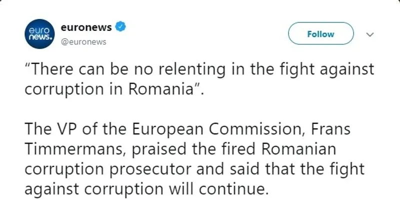 Cred că în lupta împotriva corupției, în viziunea mea, doamna Kovesi a făcut o treabă excelentă de-a lungul anilor și este un procuror foarte bun. Pot depune mărturie că am văzut la treabă și cred că este un procuror excelent. A făcut o treabă foarte curajoasă în România”, a menționat Timmermans, care face parte din aceeași familie politică cu partidul condus de Liviu Dragnea, Partidul Socialiștilor Europeni.