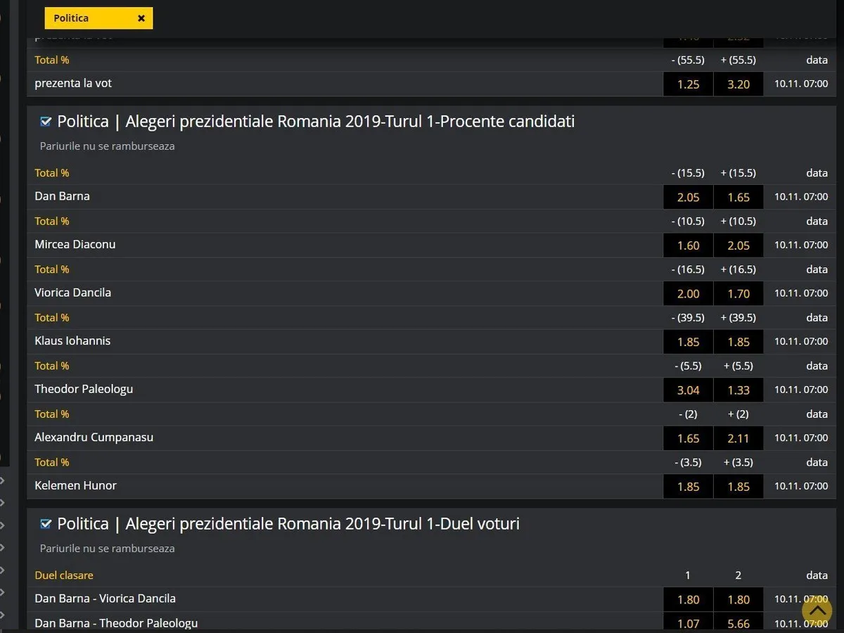 În schimb, la un duel al voturilor, Dăncilă Vs Barna este egalitate perfectă, amândoi fiind cotați cu 1,8/1. Ceea ce însemană că la 1000 de lei pariați pe Dăncilă, în cazul în care aceasta îl depășește pe Barna, câștigați 1.800 de lei.