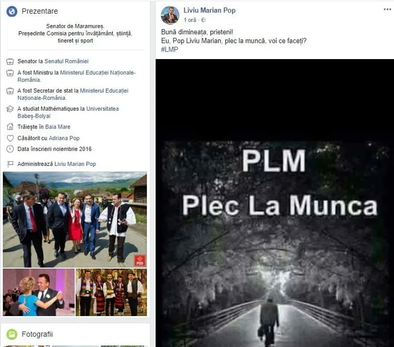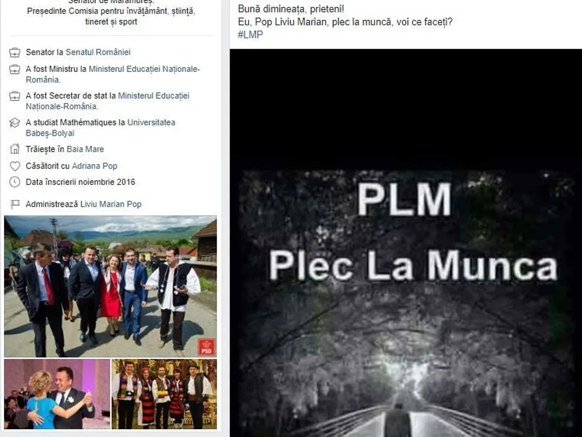 Liviu Marian Pop, fost ministru al Educației din partea PSD și actual președinte al Comisiei pentru învățământ din Senat, a distribuit marți dimineață o imagine care conține mesajul licențios ”PLM- Plec La Muncă”.