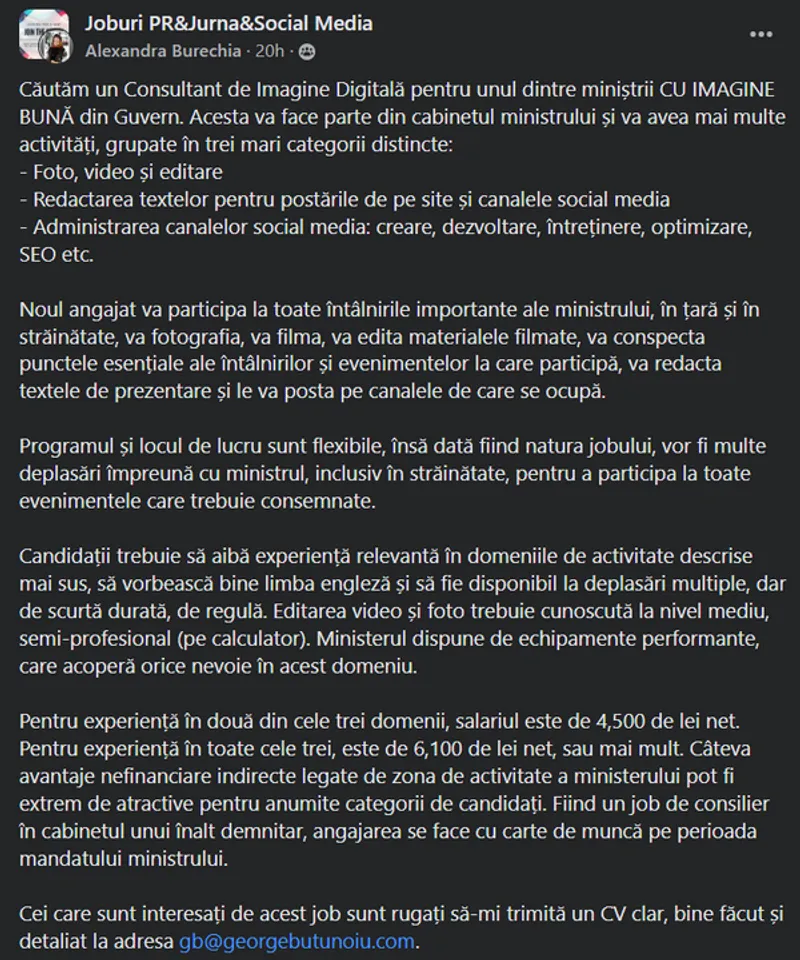 Cei care sunt interesați de acest job sunt rugați să-mi trimită un CV clar, bine făcut și detaliat la adresa [email protected]”, este anunțul postat pe grupul de Facebook „Joburi PR&Jurna&Social Media”.