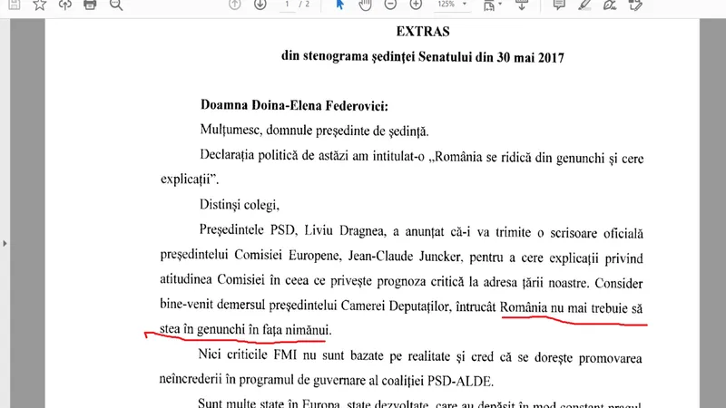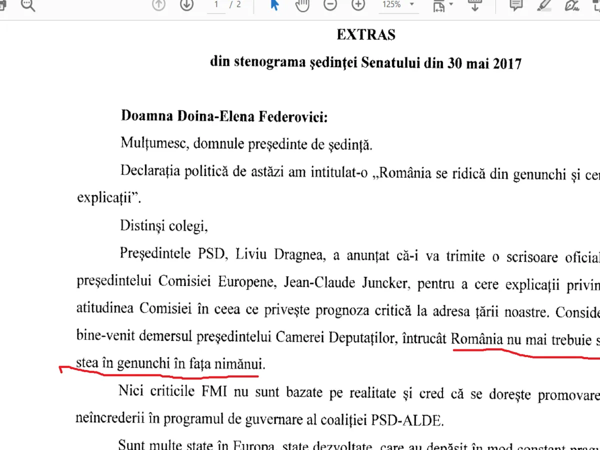 În 30 mai 2017, Doina Fedorovici se obrăznicea și ea la Uniunea Europeană într-un discurs intitulat „România se ridică din genunchi și cere explicații”.