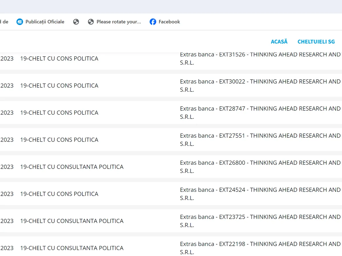 Astfel, sumele plătite drept consultanță politică acestui SRL, au crescut la 31.000 (6200 Euro) lei în iulie 2023 față de o medie de 25.000 lei (5000 Euro) în 2022.