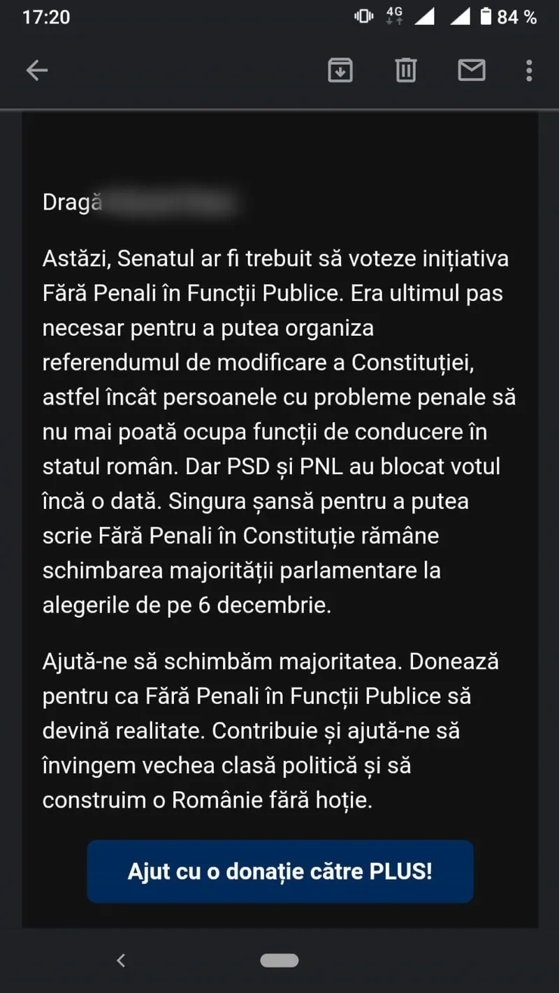 Orice contribuție este binevenită. Cu o donație de 100 de lei din partea fiecărei persoane care primește acest email, reușim să acoperim integral bugetul de campanie. Suma maximă pe care poți să ne-o donezi online este de 20.000 de lei. Mulțumim! Și ne bucurăm să te avem alături de noi. Alianța USRPLUS." - acesta este e-mail-ul trimis de partidul condus de Barna și Cioloș, în corpul căruia există și un buton prin accesarea căruia se pot face donații.