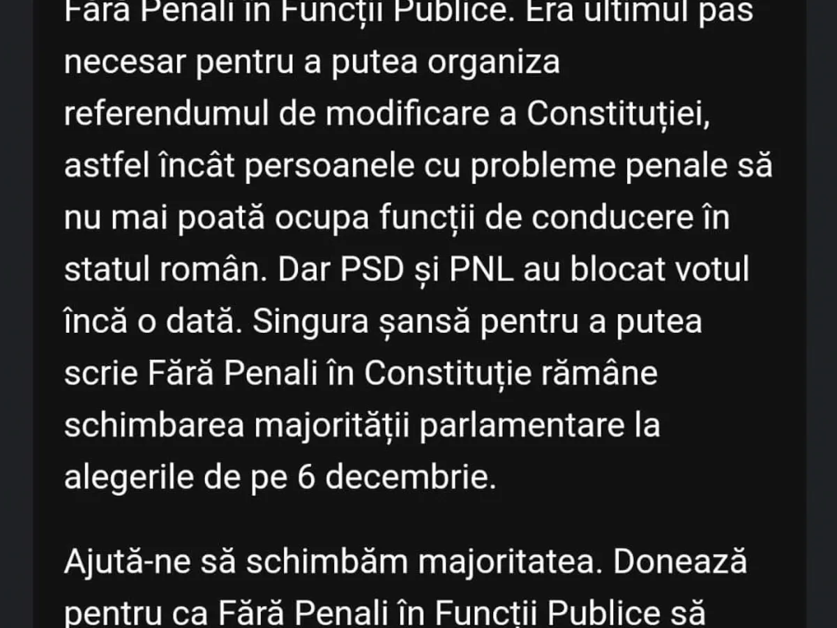 "Astăzi, Senatul ar fi trebuit să voteze inițiativa Fără Penali în Funcții Publice. Era ultimul pas necesar pentru a putea organiza referendumul de modificare a Constituției astfel încât persoanele cu probleme penale să nu mai poată ocupa funcții de conducere în statul român. Dar PSD și PNL au blocat votul încă o dată. Singura șansă pentru a putea scrie Fără Penali în Constituție rămâne schimbarea majorității parlamentare la alegerile de pe 6 decembrie.