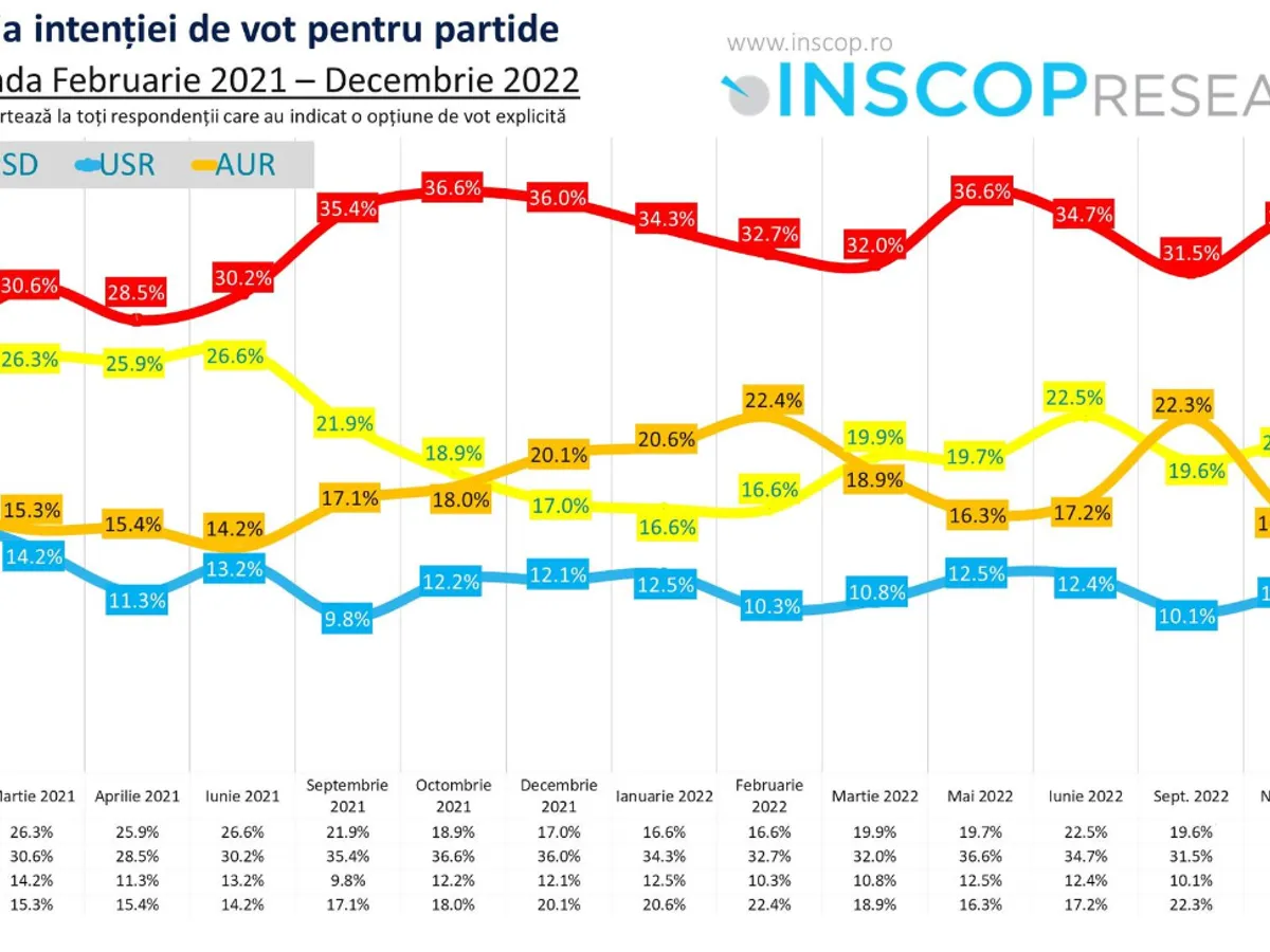 Astfel, în decembrie, PSD a ajuns la cel mai slab scor din acest an, 31,5%, PNL - 20,2%, AUR - 18,1% și USR -10,9%. De remarcat bătălia pentru locul doi în ierarhia partidelor, între PNL și AUR, formațiuni care au deținut-o alternativ pe parcursul anului.