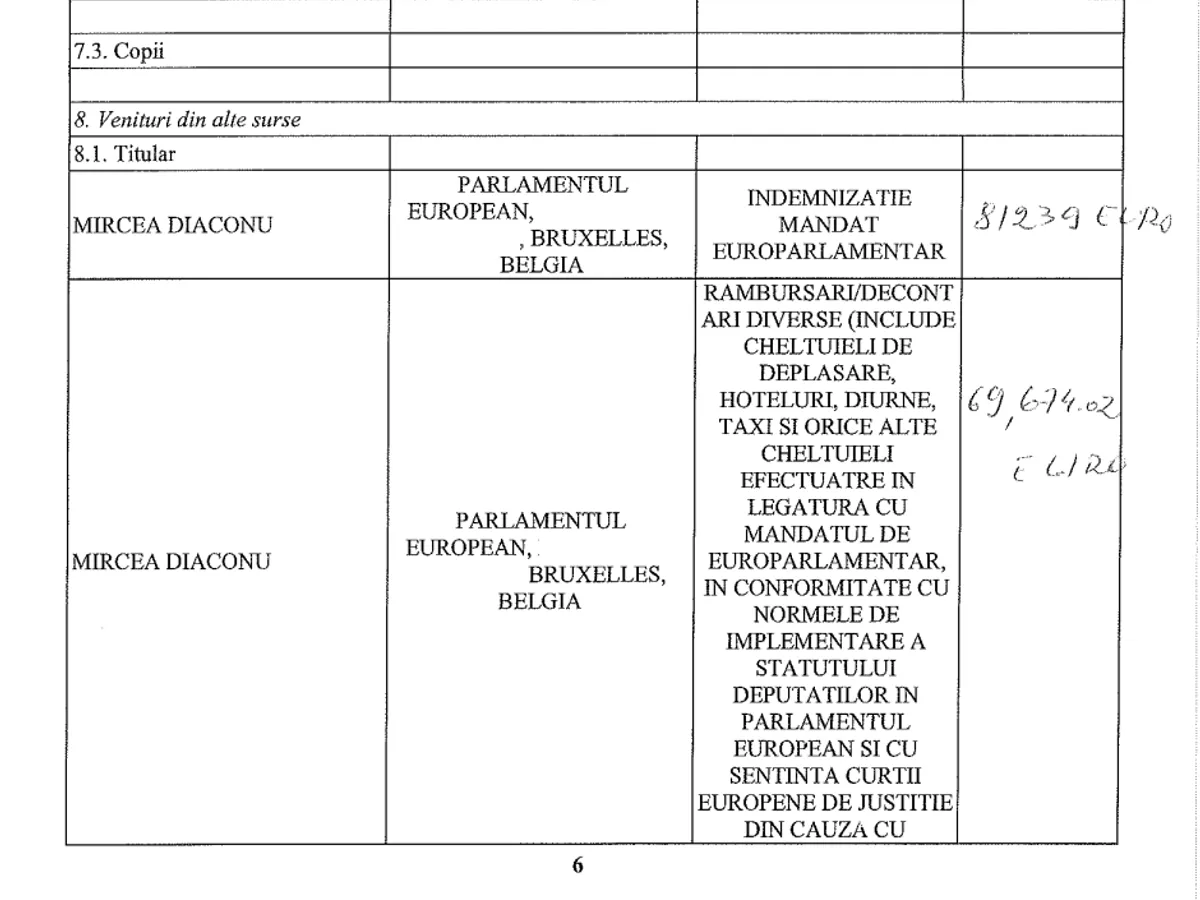 Din documentul depus de Diaconu reiese că acesta a decontat suma de 69.000 de euro pentru: hotel, taxi, și orice alte cheltuieli în legătură cu exercitarea mandatului de europarlamentar. Asta, pentru a avea o reprezentare a sumei pe care un europaramentar o poate deconta.