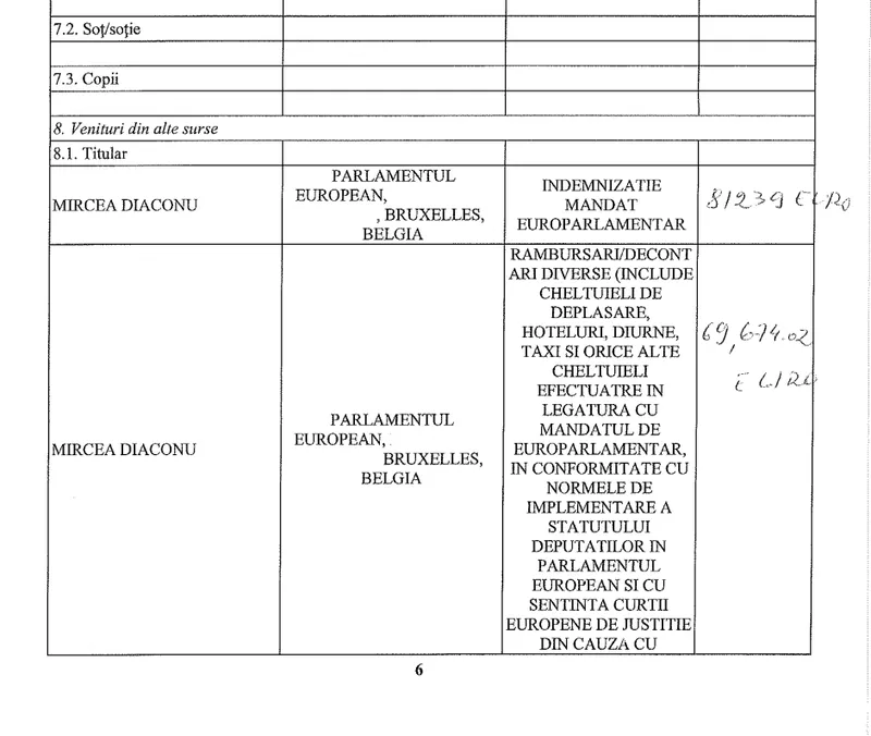 Dar salariul nu este singurul beneficiu al europarlamentarilor. Cei care sunt, azi, europarlamentari români nu și-au trecut în declarația de avere celelalte beneficii. A făcut-o, însă, eurodeputatul Mircea Diaconu în declarația de avere de la final de mandat.