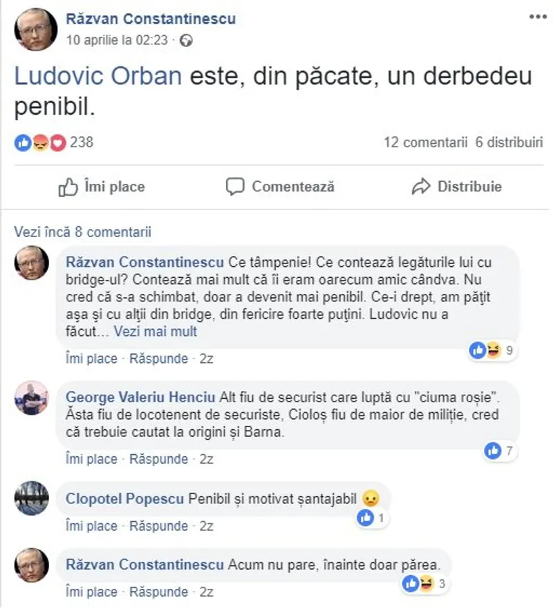 În ultimele zile, vicepreședintele filialei Iași a ALDE, medicul Răzvan Constantinescu, l-a jignit de două ori, pe Facebook, pe președintele PNL, Ludovic Orban. L-a și tăguit, ca să fie sigur că vede înjurăturile, dar acesta nu a avut vreo reacție.