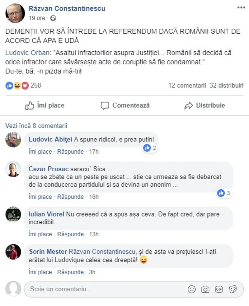 Într-o postare din 11 aprilie, cu titlul „DEMENȚII VOR SĂ ÎNTREBE LA REFERENDUM DACĂ ROMÂNII SUNT DE ACORD CĂ APA E UDĂ", Constantinescu a pornit de la o declarație a liderului PNL: „Ludovic Orban: «Asaltul infractorilor asupra Justiției... Românii să decidă că orice infractor care săvârșește acte de corupție să fie condamnat.» Du-te, bă, -n pizda mă-tii!"
