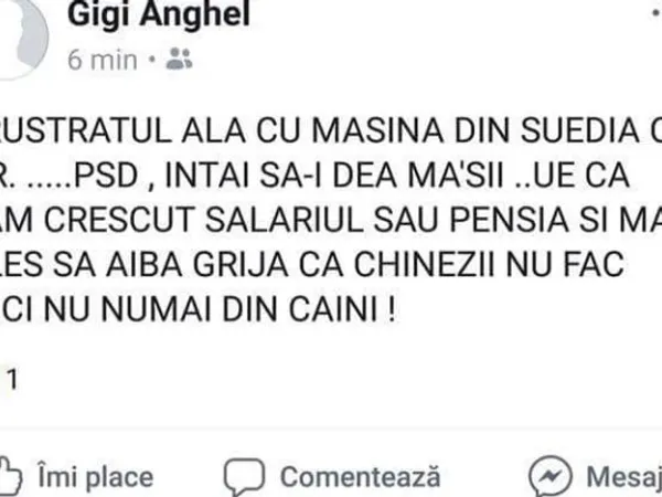 „Frustratul ăla cu mașina din Suedia cu nr. ….PSD, întâi să-i dea mă-sii ..ue că i-am crescut salariul sau pensia și mai ales să aibă grijă că chinezii nu fac mici nu numai din caini”, a scris Anghel pe Facebook.