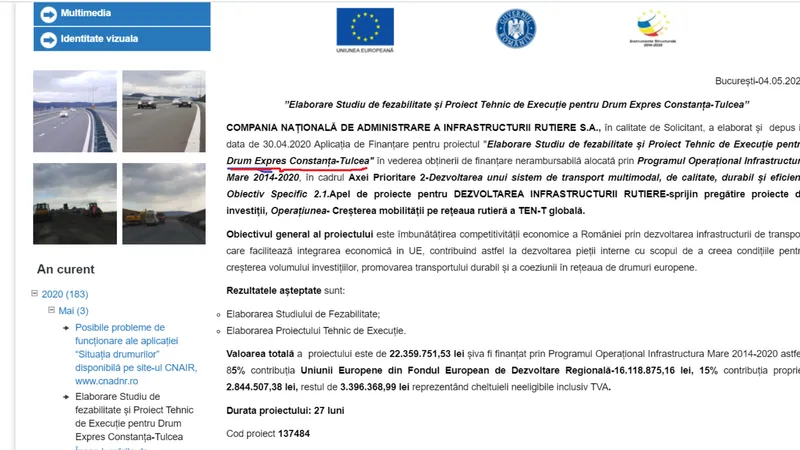 Compania Națională de Administrare a Infrastructurii Rutiere a anunțat, pe 30 aprilie 2020, scoaterea la licitație a Studiului de Fezabilitate pentru Drumul Expres Constanța – Tulcea.
