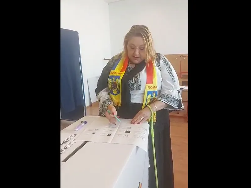 Diana Șoșoacă a votat în acestă dimineață la o secție din București. Îmbrăcată în ie, cu steagul României în jurul gâtului și însoțită de cățelul ei Pufi, eurodeputata a făcut un adevărat show live pe Facebook, „personalizându-și” buletinul de vot.