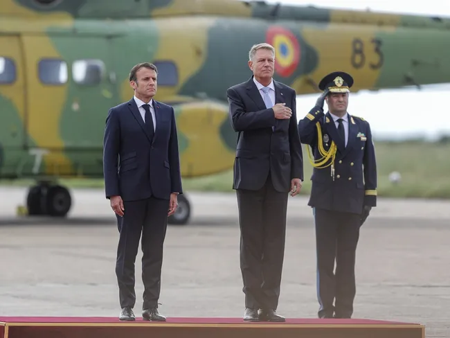 Preşedintele Franţei, Emmanuel Macron, a fost primit oficial, miercuri dimineaţa, la Baza "Mihail Kogălniceanu", de către şeful statului român, Klaus Iohannis.