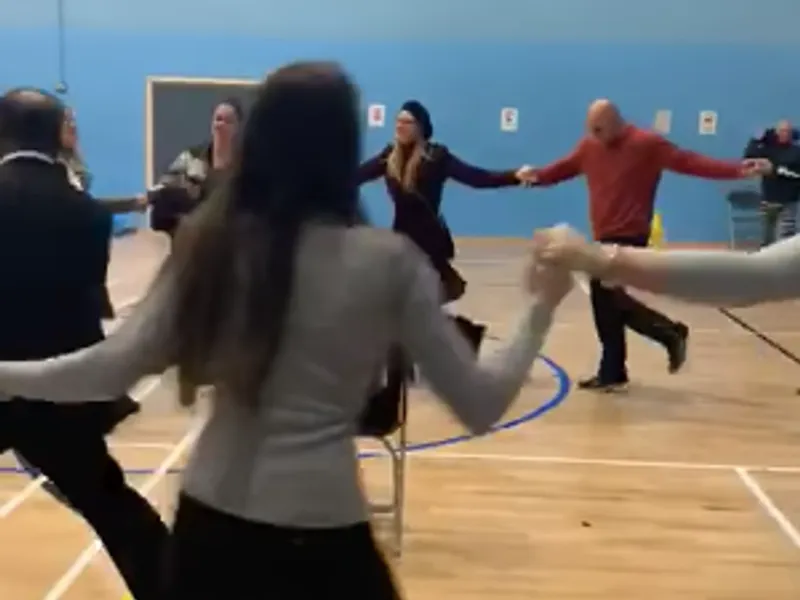 Românii din secția 551 din Harrow, Londra, s-au apucat să joace hora chiar în sala de sport în care se desfășoară procesul electoral, potrivit unor imagini filmate de un student și distribuite, sâmbătă, pe Facebook.