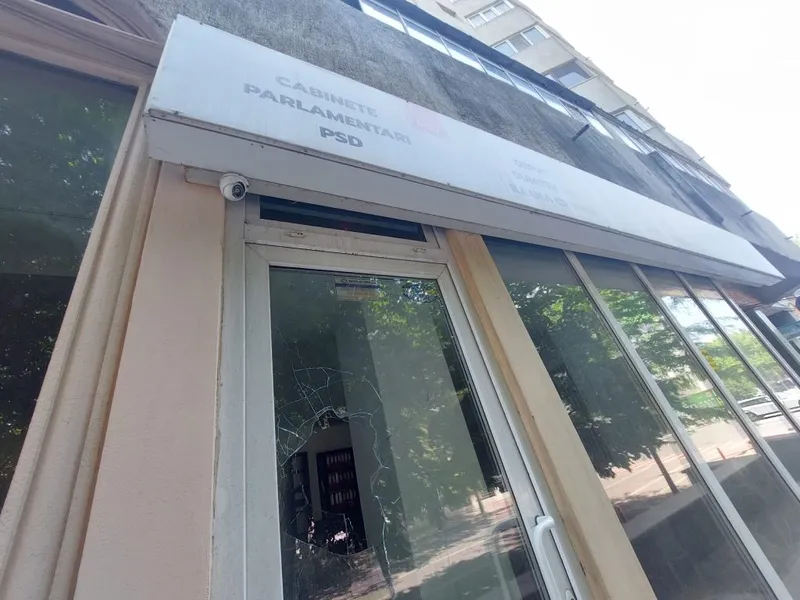 Sediul Cabinetelor Parlamentare PSD din zona Spitalului Județean a fost vandalizat de doi cetățeni care au spart un geam și au lăsat un mesaj: „Tăiați pensiile speciale”.