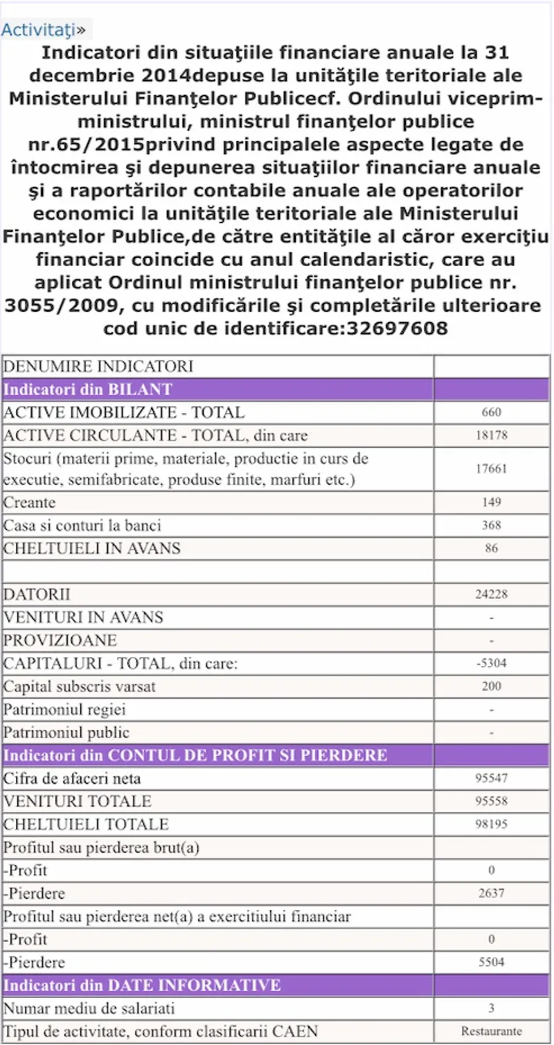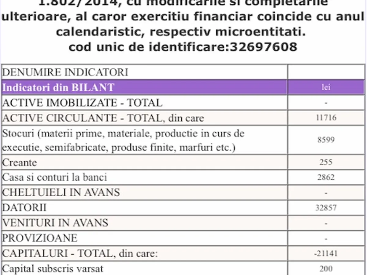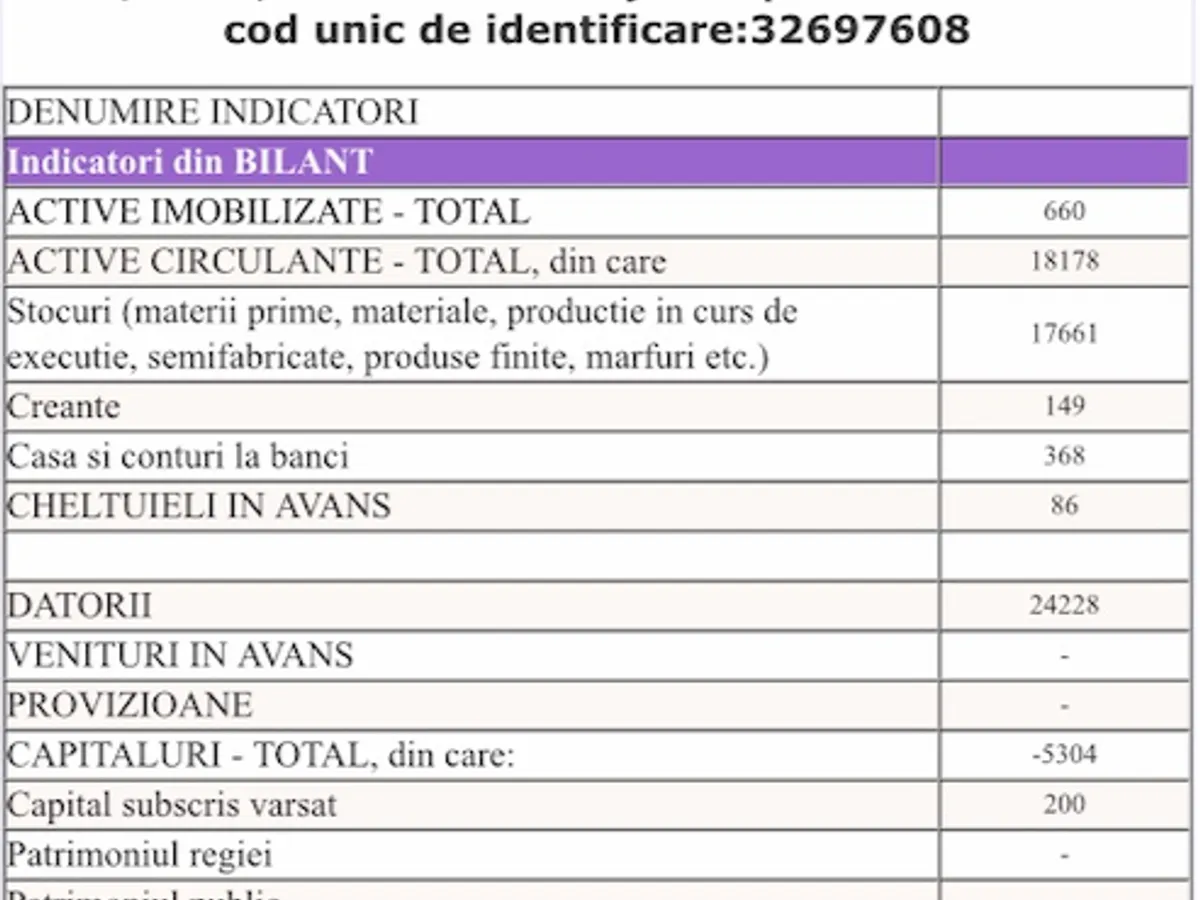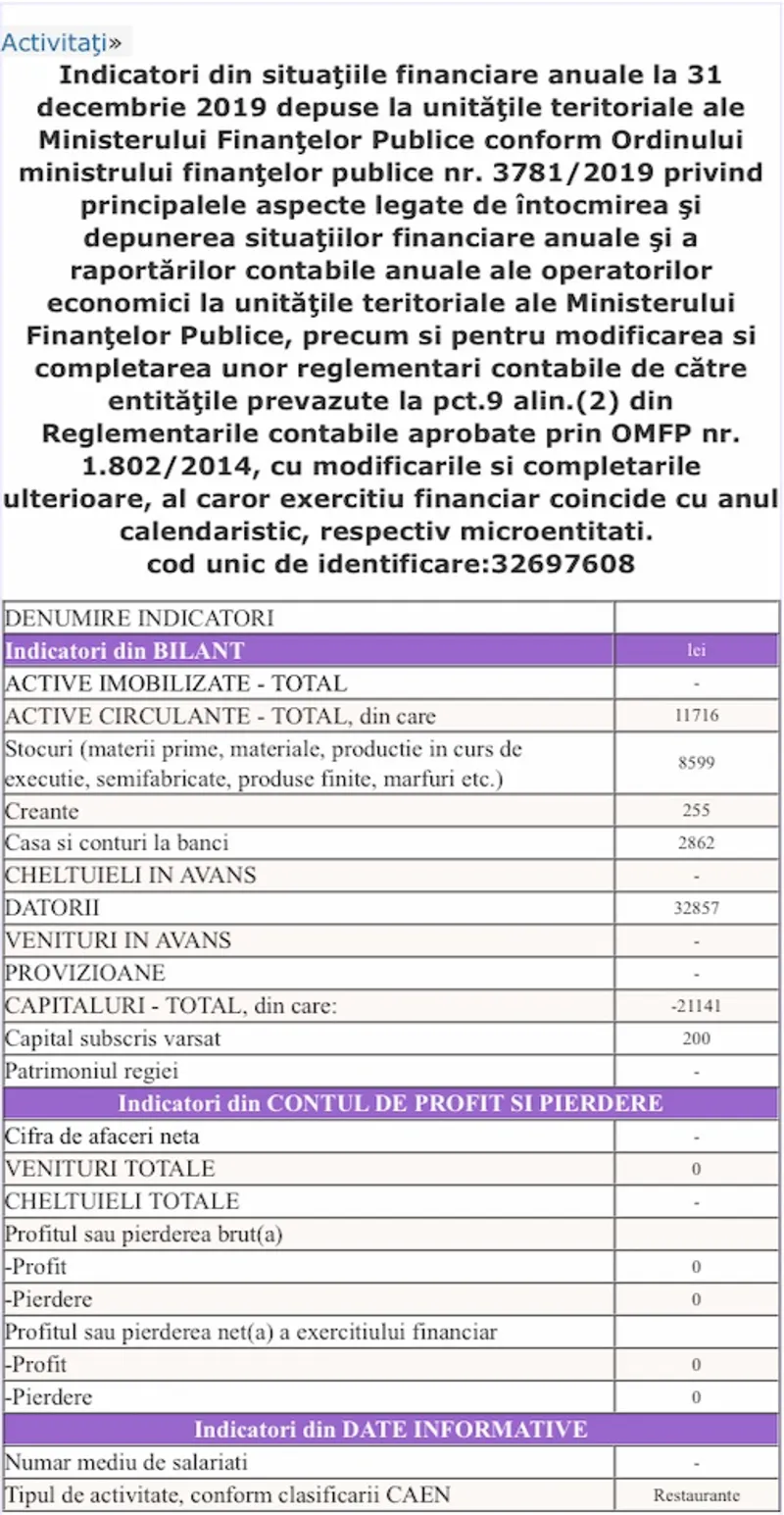 După cum arată datele din bilanțul contabil al firmei, veniturile au fost zero în 2019 (ca și în 2018 și 2017), dar datoriile sar de 32.000 de lei.