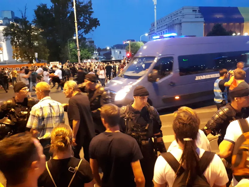 UPDATE 22.45: Răzvan Chiruță, redactor-șef Newsweek România: “Jandarmii au fost excesiv de furioși în seara asta. Au oprit brutal mulțimea să ocupe bulevardul, o parte din protestatari au reacționat, aruncând cu sticle de apă. Unii s-au așezat pe jos, pentru a nu fi dați deoparte de jandarmi. Apoi aceștia din urmă au început să monteze garduri.Acum, câțiva grupați pe două rânduri, cu căști de protecție, așteaptă pe Bulevardul Aviatorilor, la o distanță mică de cei care protestează.Tensiunea e maximă.”