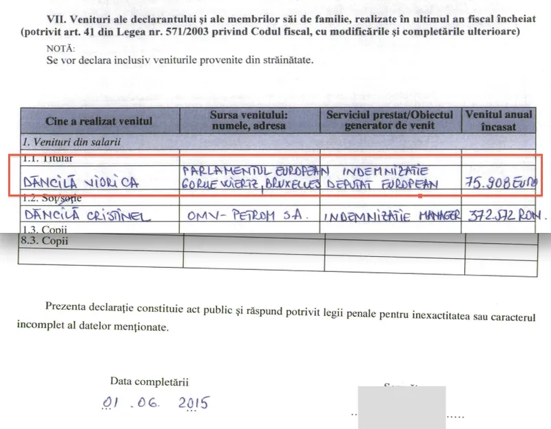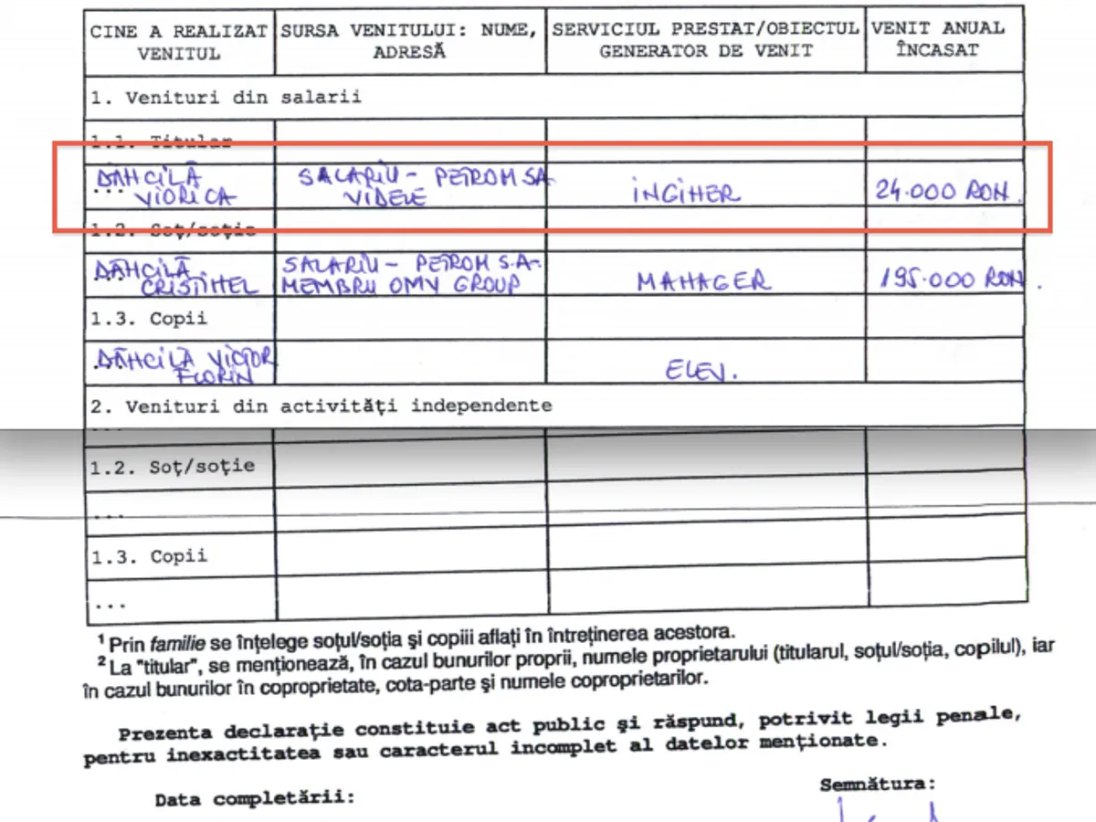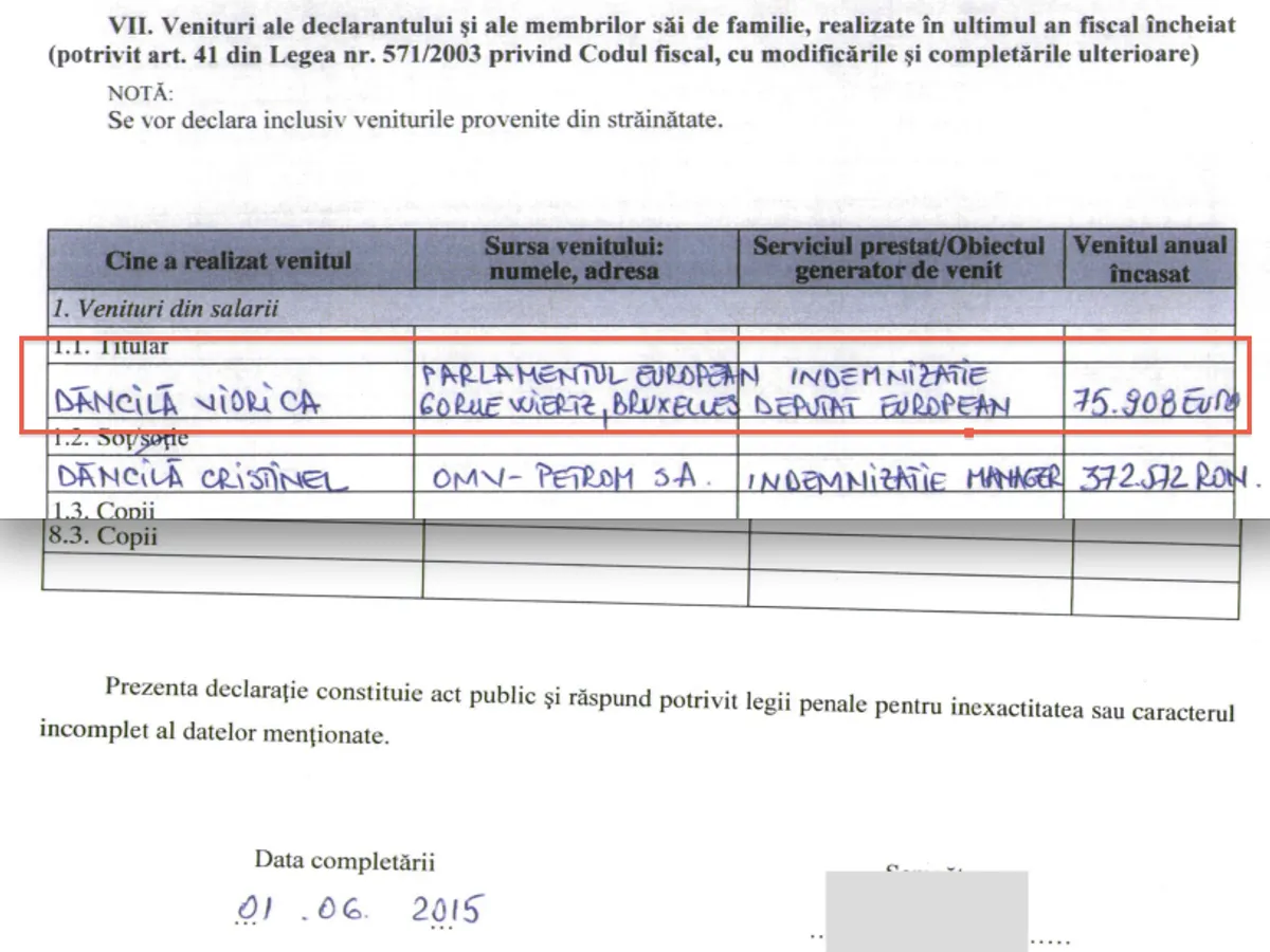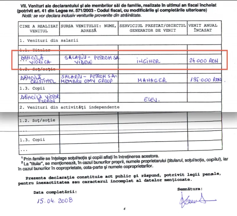 Într-una din declarațiile de avere din 2008, Viorica Vasilica Dăncilă menționa, în calitate de "inginer" la Petrom, venituri de 24.000 de lei lunar. Conform propriului CV, Dăncilă era, în aceeași perioadă, și profesor la un liceu industrial din Videle. Nici un venit, însă, furnizat de acel liceu nu apare în documentul pomenit.