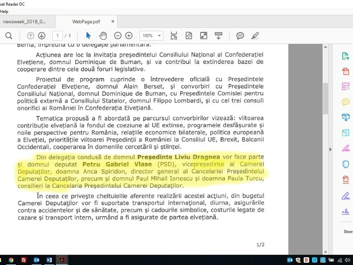 Din delegația care l-a însoțit pe Liviu Dragnea în vizita oficială în Elveția au făcut parte, potrivit memorandumul intern publicat de Camera Deputaților: deputatul Gabriel Vlase, Anca Spiridon, director la cabinetul Președintelui Camerei Deputaților, precum și doi consilieri parlamentari, Paul Mihai Ionescu și Paula Turcu.