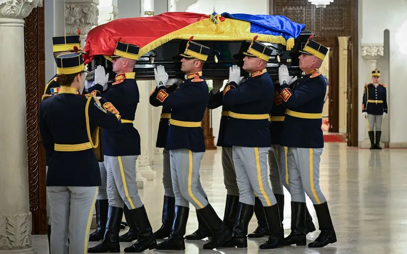 - Sicriul este purtat spre ieșirea oficială din Palatul Cotroceni (traseu: Sala Unirii - Galeria Basarabilor - Holul de Onoare – Copertină);