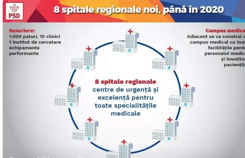 Dar PSD a câștigat alegerile și a promis, din nou, că va termina un număr de 8 spitale regionale. Echipa lui Dragnea a promis: „construirea a 8 spitale regionale, dotate cu echipamente de ultimă generație”.