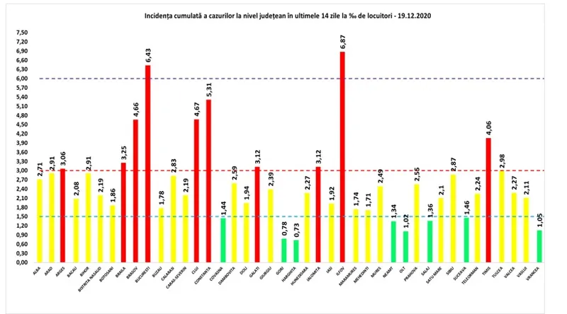 Coeficientul infectărilor cumulate la 14 zile, raportate la 1.000 de locuitori este calculat de către Direcțiile de Sănătate Publică, la nivelul Municipiului București și al județelor. Mai jos aveți graficul realizat în baza raportărilor primite de CNCCI de la Direcțiile de Sănătate Publică: