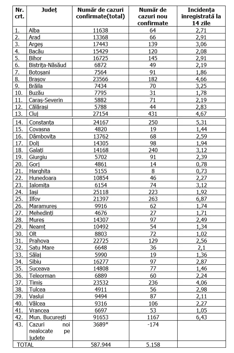 În total, în România au fost confirmate 587.944 de cazuri de infectare cu coronavirus, iar 14.296 de oameni infectați au murit.