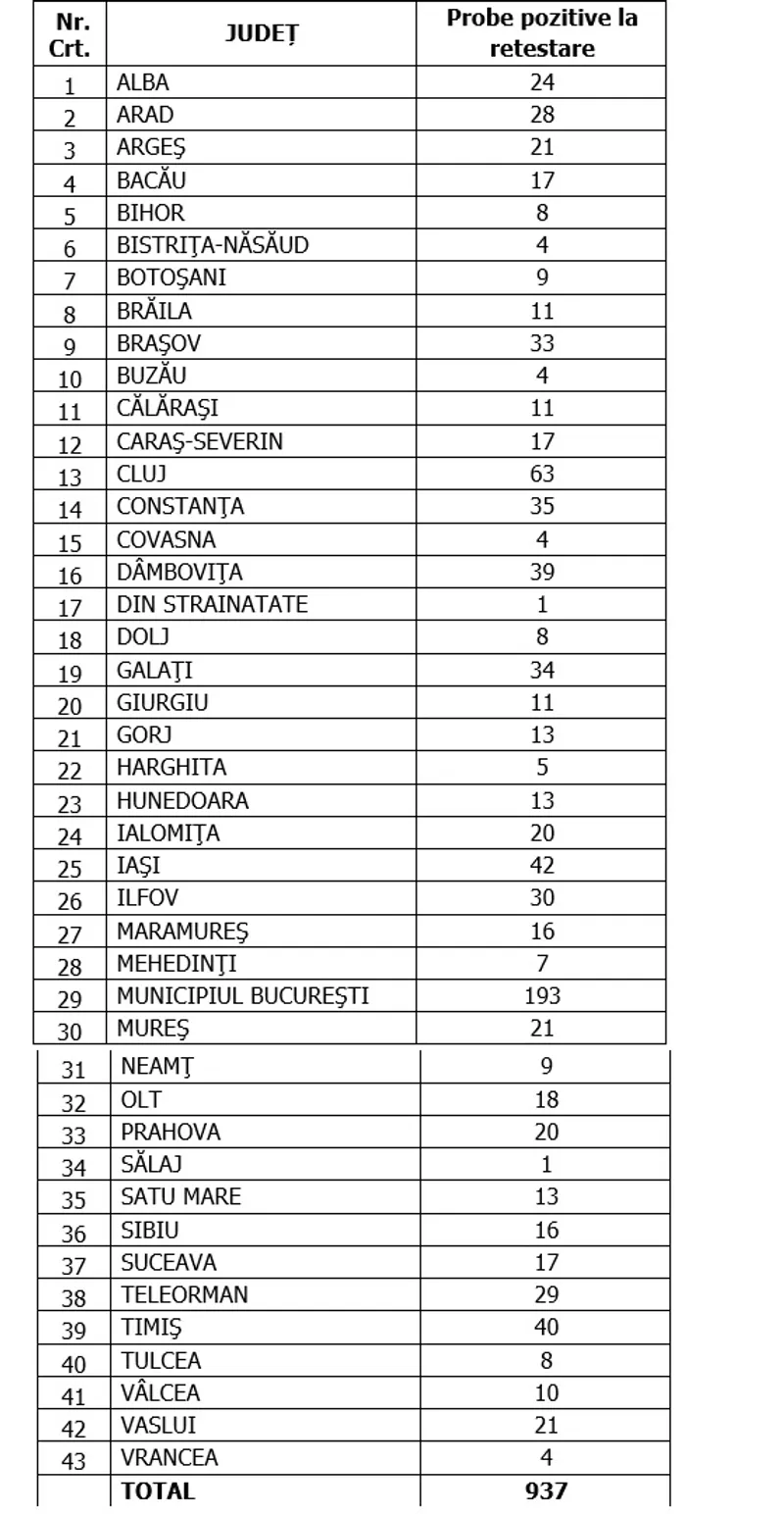 Distinct de cazurile nou confirmate, în urma retestării pacienților care erau deja pozitivi, 937 de persoane au fost reconfirmate pozitiv.