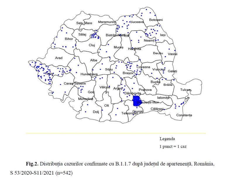 B.1.1.7 - varianta din Marea Britanie (542): Argeș (2), mun.București (258), Bihor (11), Brăila (1), Botoșani (5), Brașov (8), Caraș-Severin (4), Cluj (22), Constanța (9), Covasna (18), Dâmbovița (10), Dolj (2), Galați (6), Giurgiu (3), Gorj (6), Hunedoara (3), Iași (16), Ilfov (29), Mureș (3), Neamț (6), Olt (1), Prahova (3), Sibiu (4), Suceava (22), Teleorman (2), Timiș (72), Tulcea (1), Vâlcea (4), Vrancea (2), Vaslui (3), ”din străinătate” (cazuri de import) (6);
